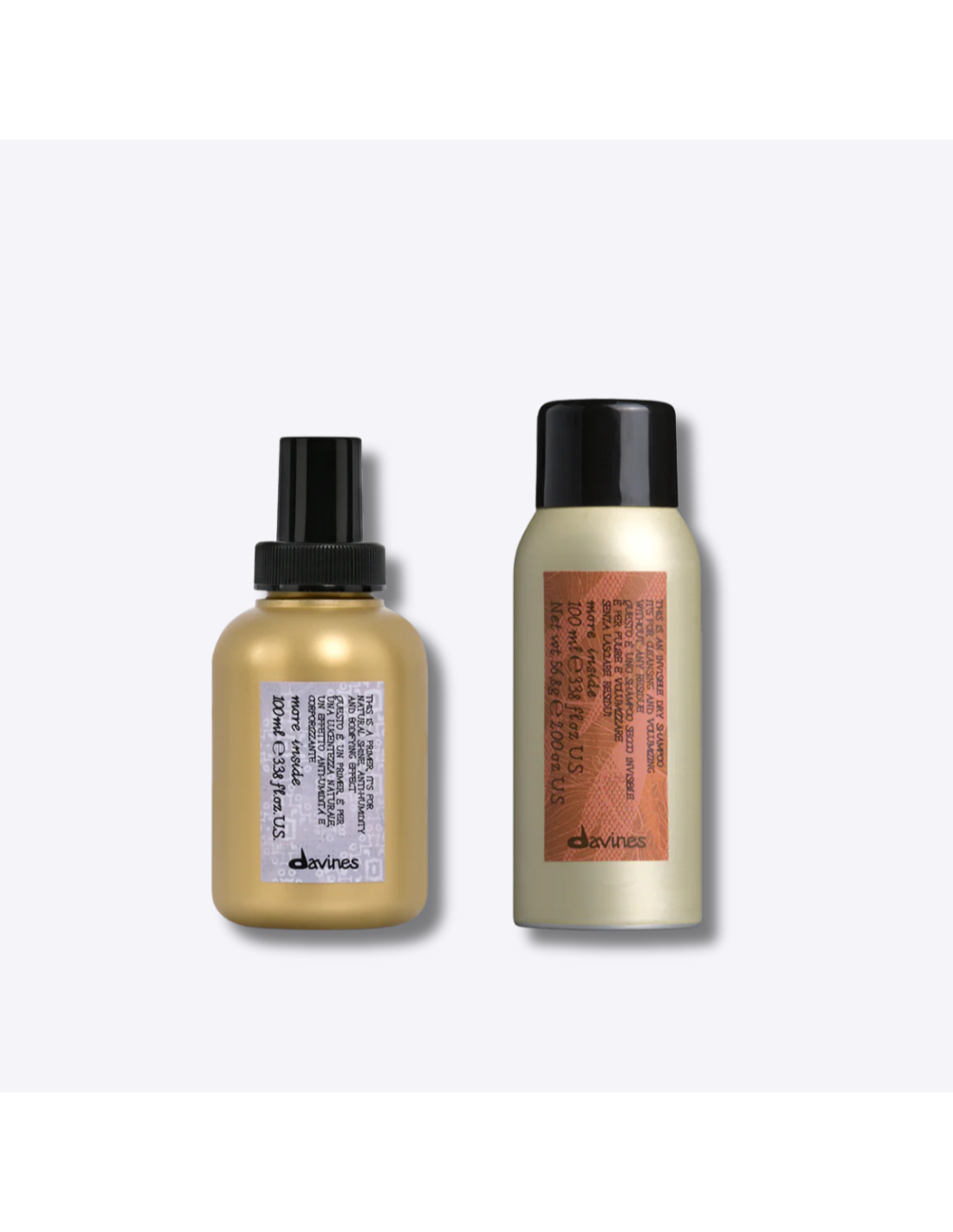 Este dúo combina un primer que prepara todo tipo de cabello para el styling —a la vez que ofrece protección térmica de hasta 230 °C— con un champú en seco que refresca el cabello absorbiendo el exceso de grasa sin dejar residuos. Ideal para mantener el peinado entre lavados.